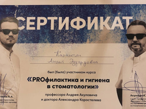 Наш гигиенист Анаит Карапетян прошла курс «Proфилактика и гигиена в стоматологии», тем самым усовершенствовав свои навыки в профилактике кариеса
